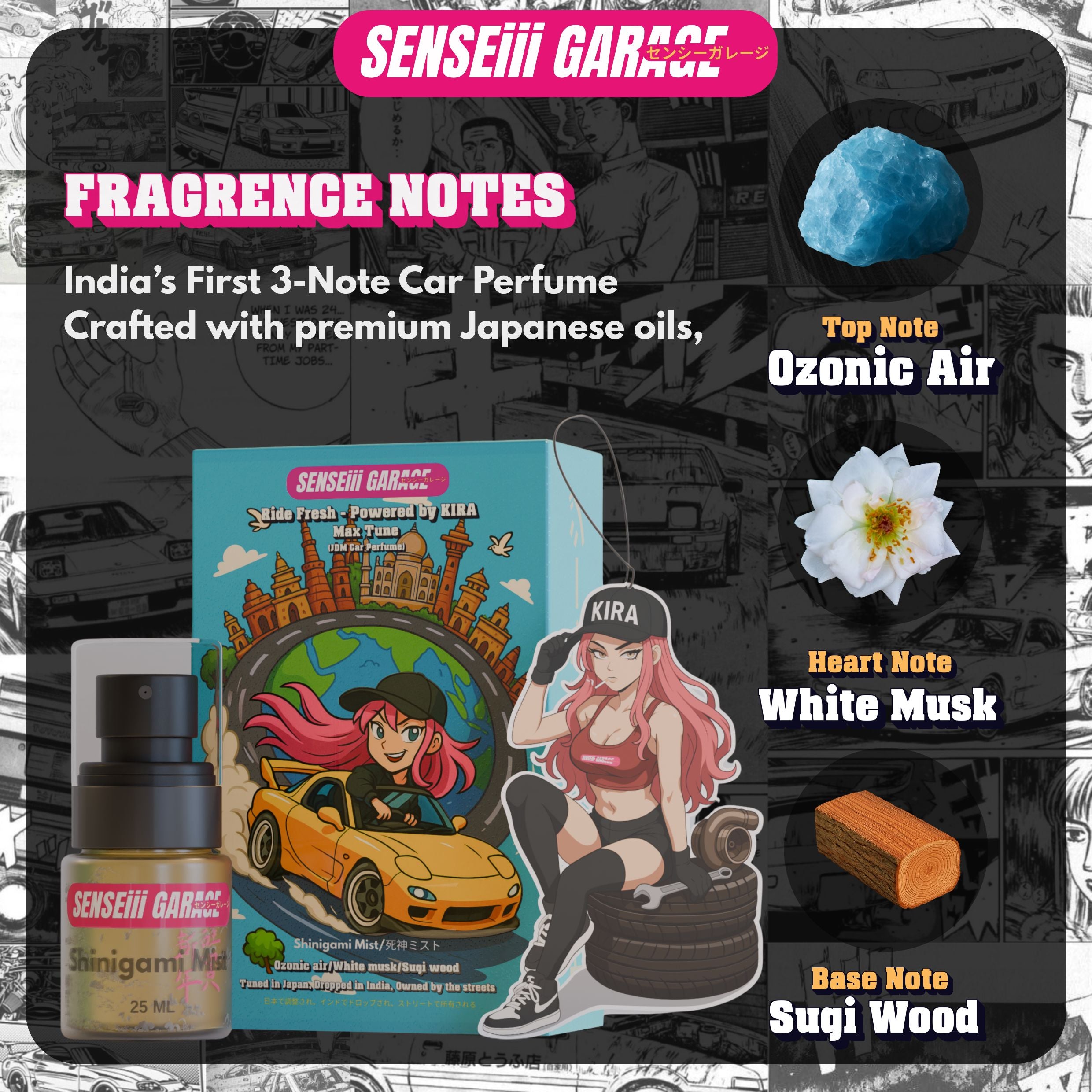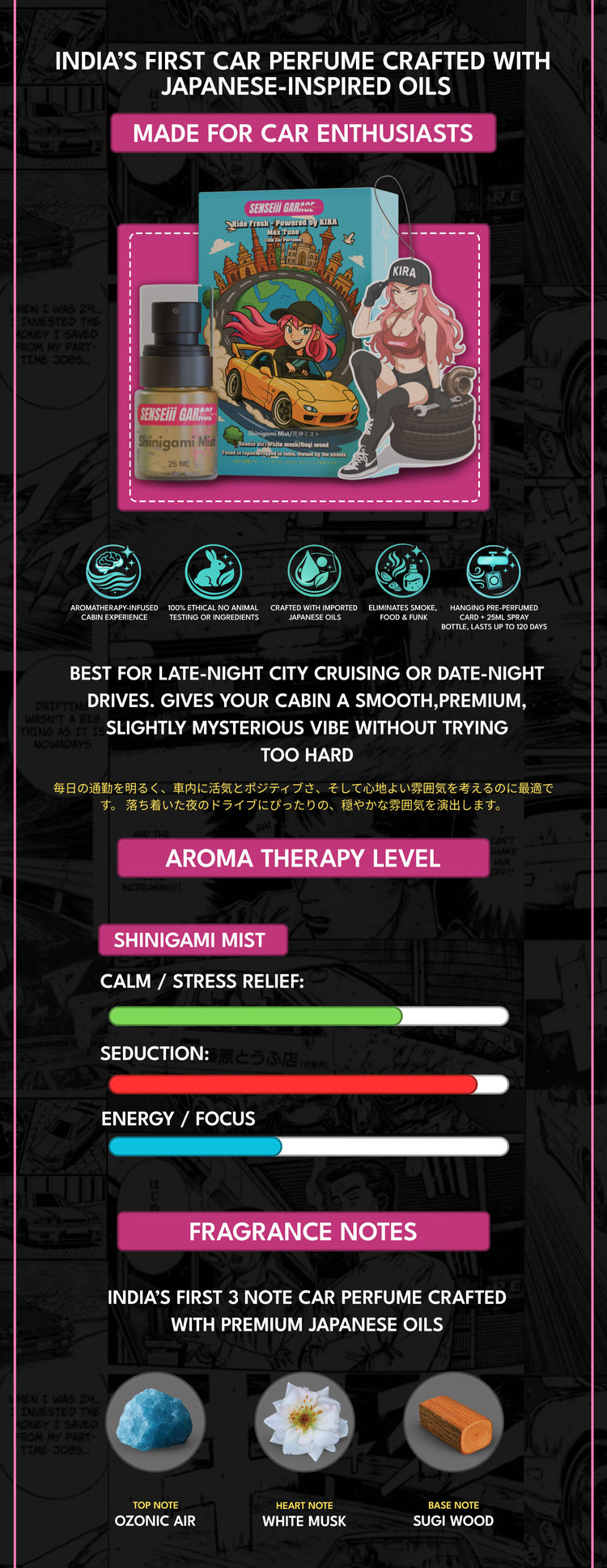 India’s first luxury car perfume with Japanese-inspired oils, created exclusively for discerning car enthusiasts.